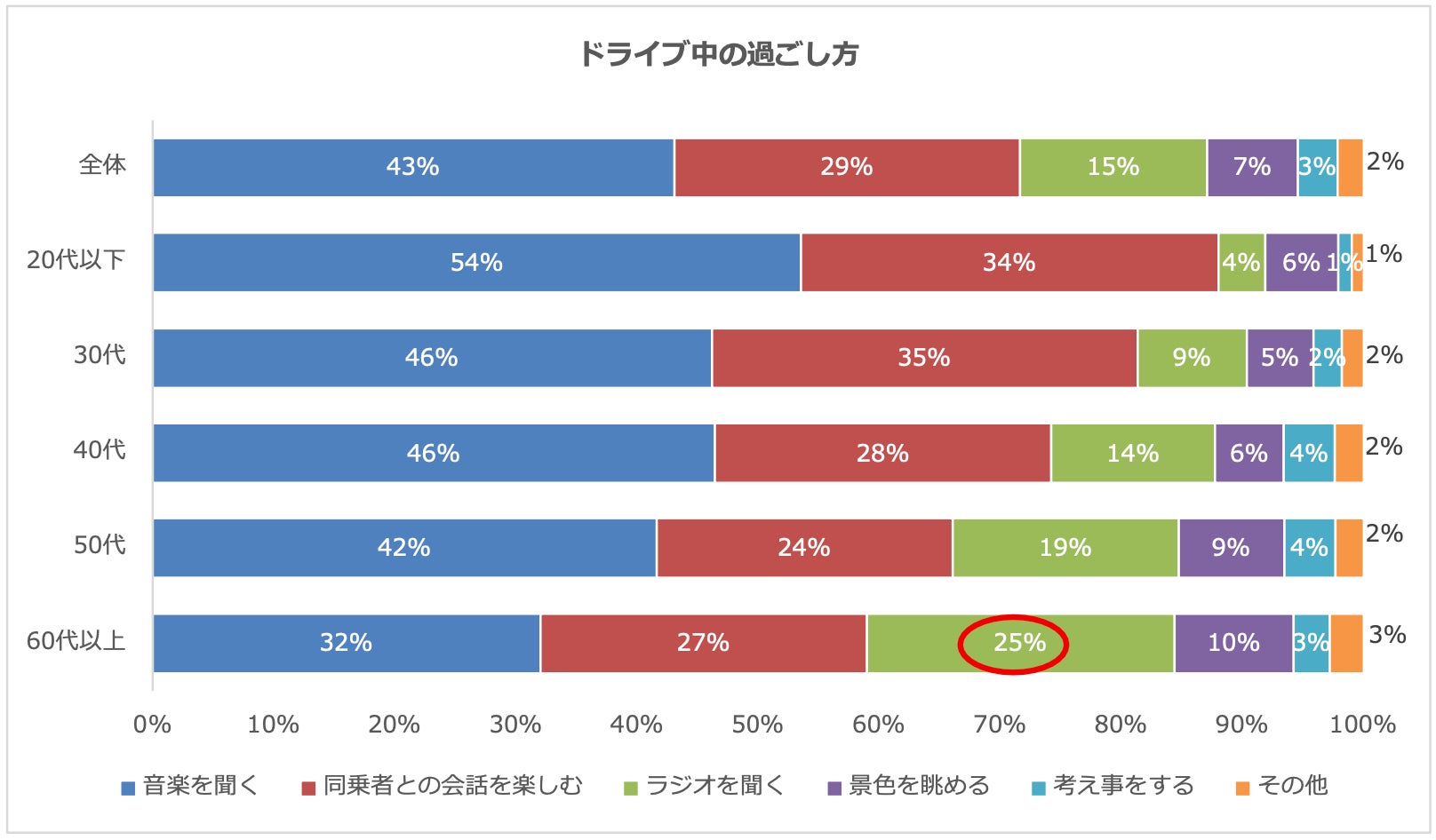 年代別で見ると、20代以下は半数以上が音楽を聞きながらドライブを楽しんでいるようです。年代が上がるほどラジオを聞く比率が高くなり、60代以上の4人に1人はラジオを聞きながらクルマを運転しているようです。