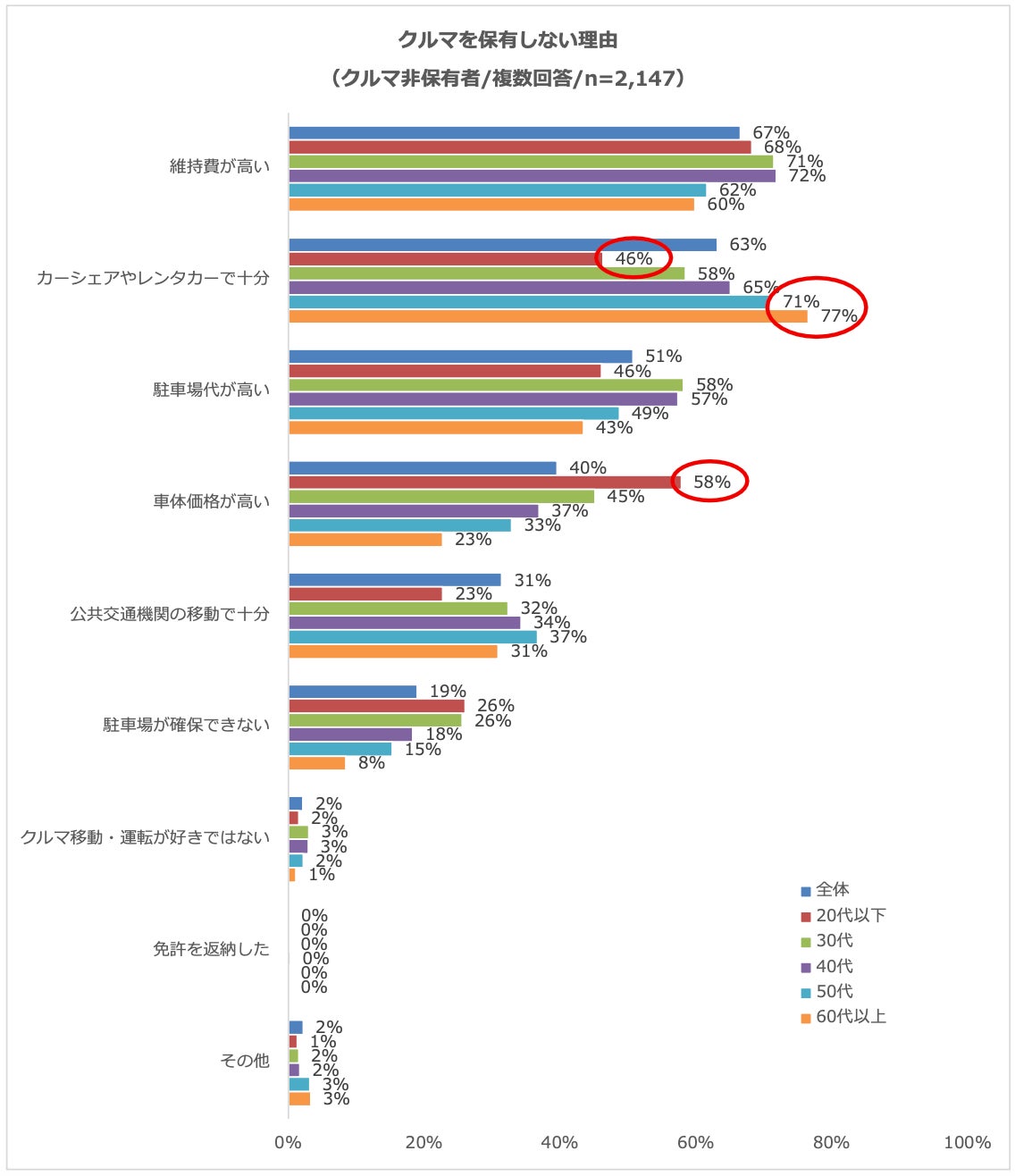 年代別で見ると、年代を問わず6割以上が「維持費が高い」と回答しました。なお、年代が上がるほど「カーシェアやレンタカーで十分」の割合が高くなり、30代以上では半数を超え、なかでも50代以上では7割以上にのぼりました。