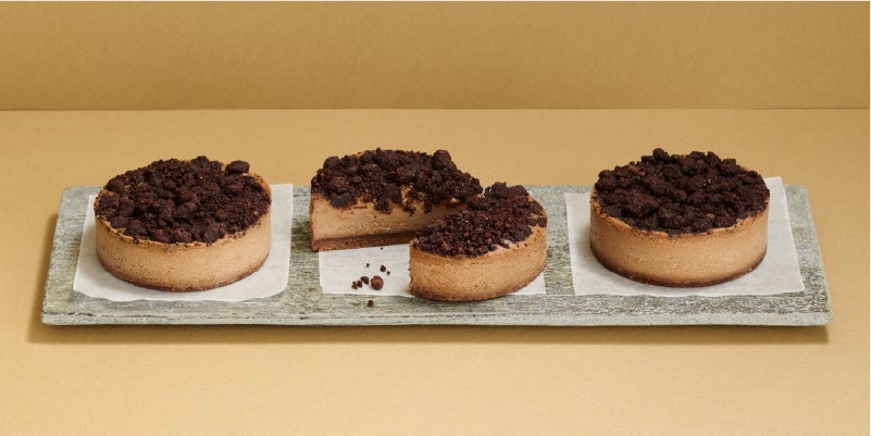 表面にクランブルを重ね、香ばしさと食感のアクセントを加え、カカオの風味がチーズケーキの味わいを引き立てています。