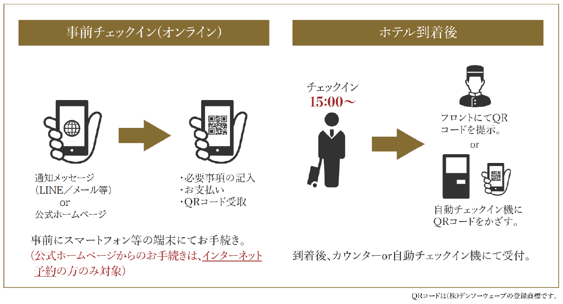 当ホテルでは、通知されたメッセージや公式ホームページからオンライン上でのレジカードの記入やお支払いなどの手続きを宿泊前に行うことで、ホテル到着後は本人確認と鍵の受け渡しのみとなる「事前チェックイン」サービスを昨年から提供しており、手続きが完了するとQRコードが発行され、当ホテル内のセルフチェックイン端末にかざすことで、最短10秒以内のスムーズなチェックインも可能になります。