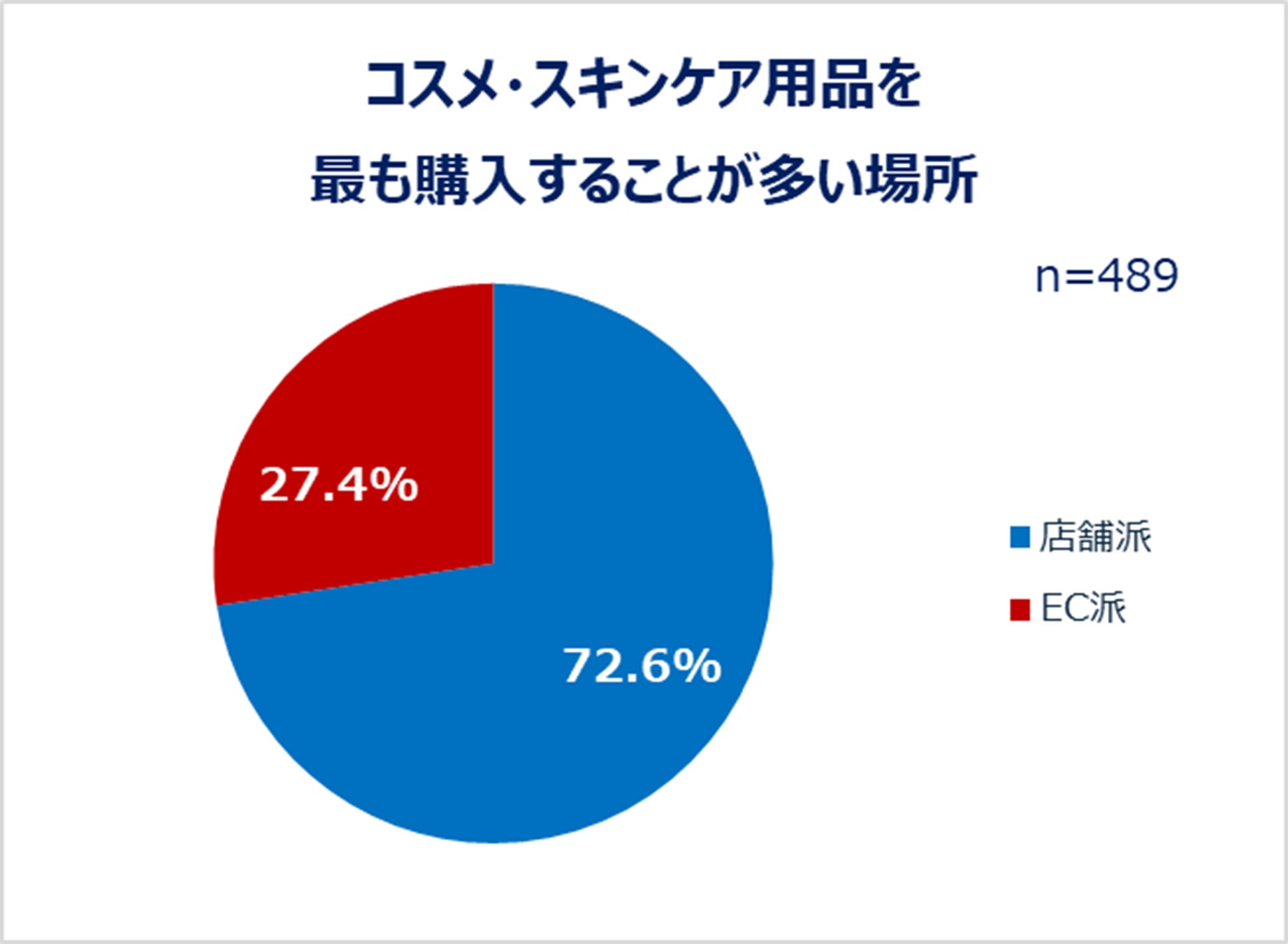 コスメやスキンケア用品をどこで購入しているか聞いたところ、1位は「ドラッグストア(87.6%)」、2位は「ECモール(48.8%)」でした。店舗からオンラインまで、幅広い場所で購入されていることが分かります。そのうち「最もよく購入する場所」を聞き、「ドラッグストア」「バラエティショップ」「デパート・百貨店」と回答した人を「店舗派」、「ECモール」「ブランド直販のECサイト」「フリマアプリ」と回答した人を「EC派」として集計すると(「その他」と回答した人は除外)、店舗派が72.6%、EC派が27.4%という結果になりました。