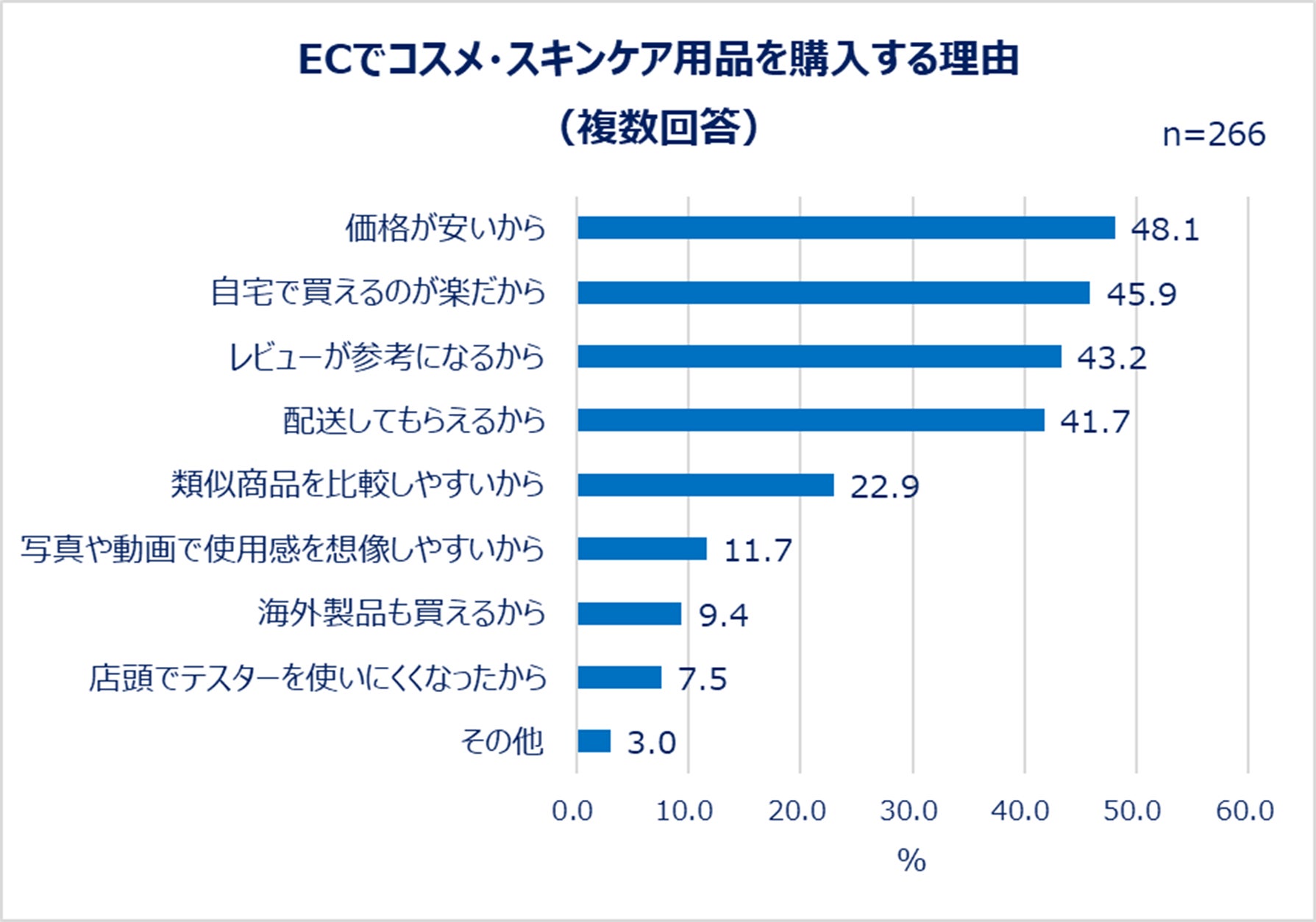 「ECモール」「ブランド直販のECサイト」でコスメ・スキンケア用品を購入したことがある人を対象に、ECで買う理由を聞きました。1位は「価格が安いから(48.1%)」。「自宅で買えるのが楽だから(45.9%)」「レビューが参考になるから(43.2%)」「配送してもらえるから(41.7%)」にも比較的多くの票が入り、ECは金銭面と利便性の両面から評価されていることが分かりました。