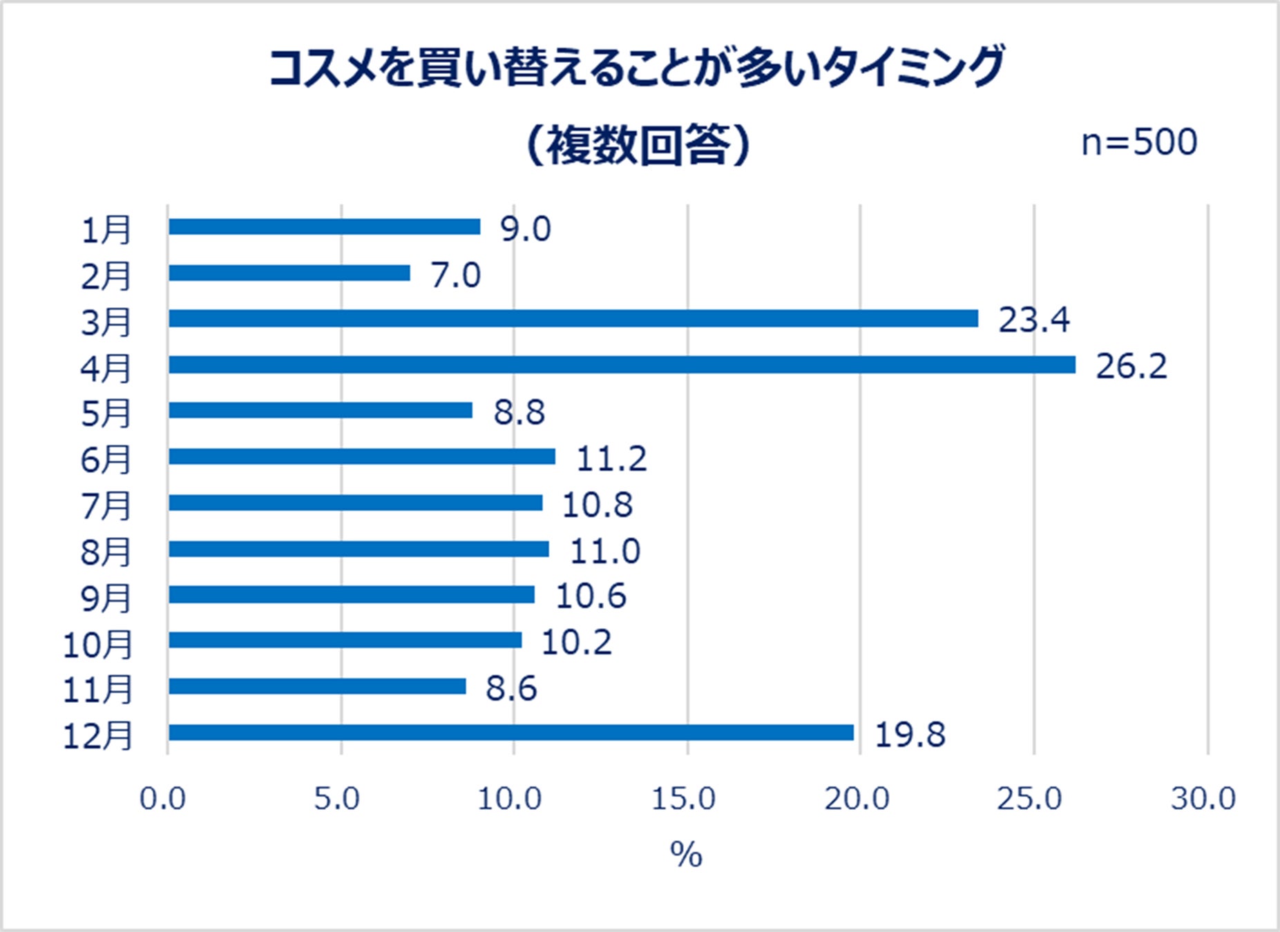 コスメを買い替えることが多いタイミングを聞いた質問では、「4月(26.2%)」「3月(23.4%)」が上位に。新生活や出会いの季節である春、女性たちのコスメの購入意向は高まっていると考えられます。