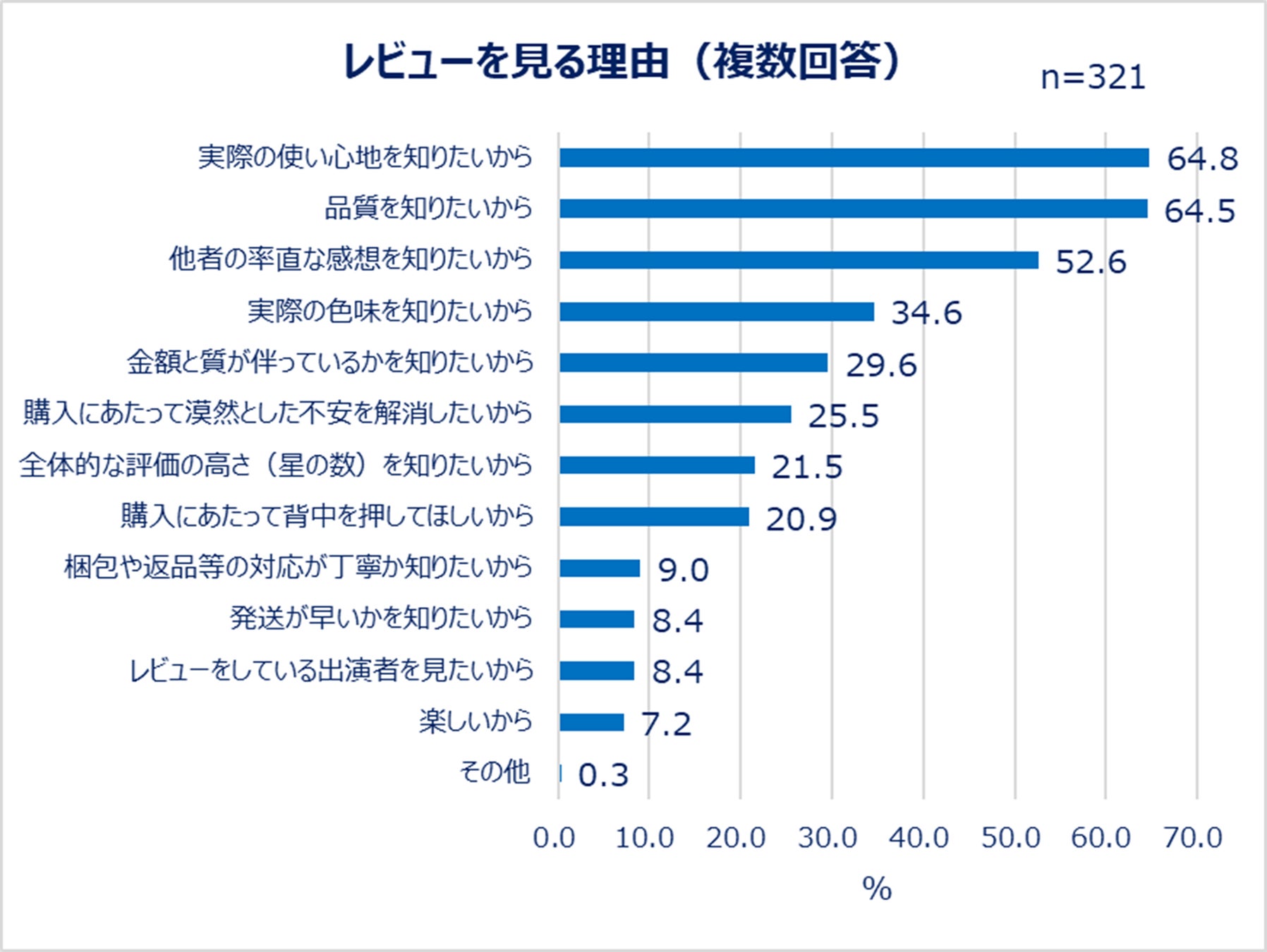 レビューを見る理由としては、「実際の使い心地を知りたいから(64.8%)」「品質を知りたいから(64.5%)」に特に多くの回答が集まりました。肌に直接使用するコスメやスキンケア用品ですが、事前には試しにくいため、他者の感想を知るためにレビューを活用している人が多いと考えられます。
