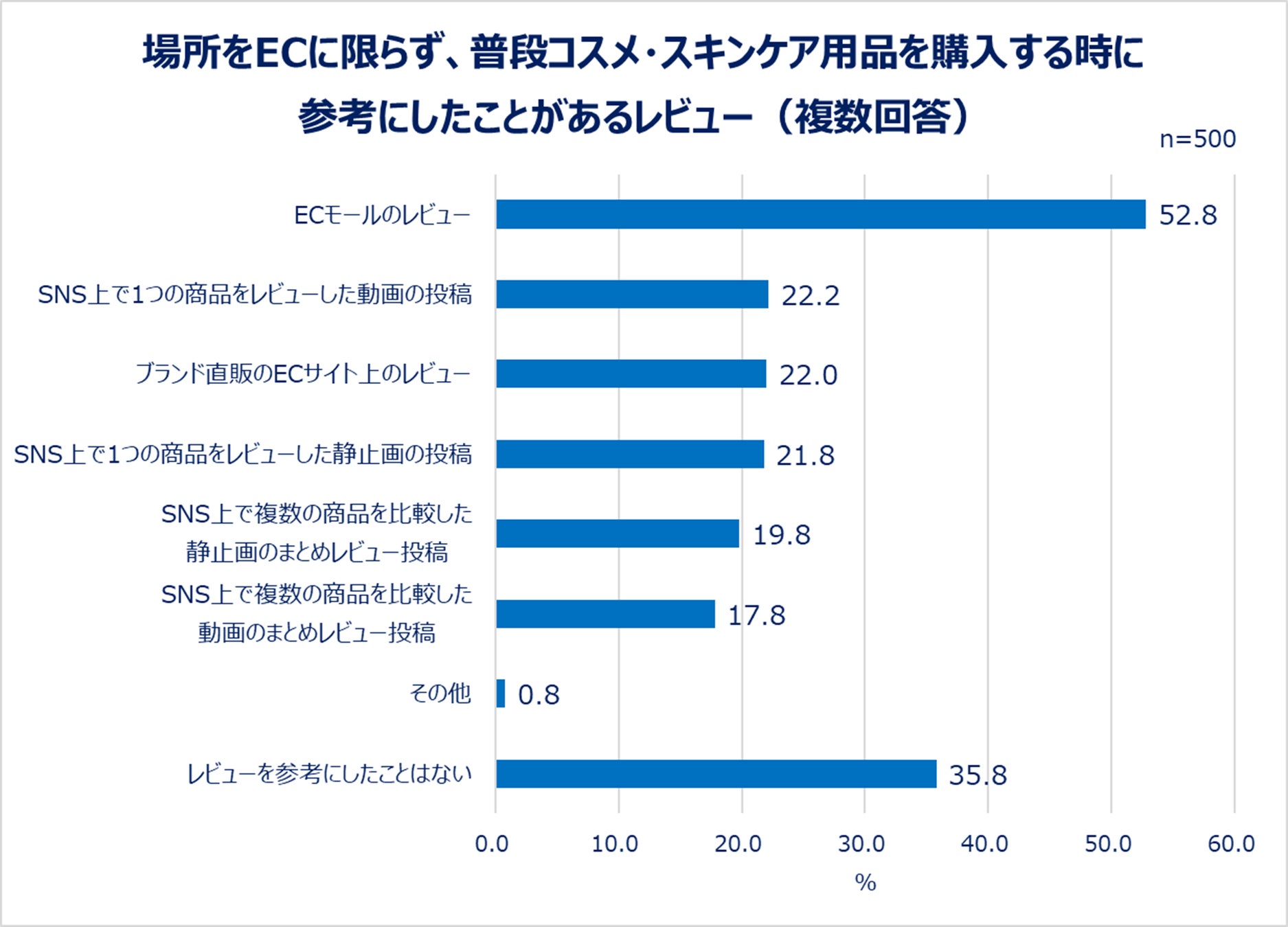 SNS上でのコスメレビュー投稿など、ECに限らず、「レビュー」は様々な形で情報を提供してくれます。ECに限らず、普段コスメやスキンケア用品を購入する際にどのようなレビューを参考にしたことがあるか聞いたところ、6割以上の人が何かしらのレビューを参考にしたことがあると分かりました。SNS上のレビューにおいては、わずかな差ではありますが、複数の商品を比較した「まとめレビュー」よりも、1つの商品に言及したレビューのほうがよく参照されているようです。