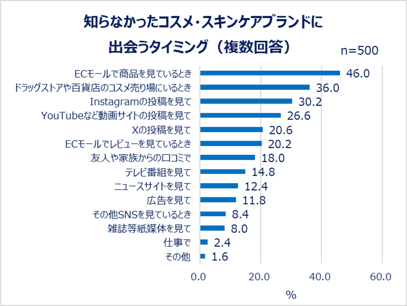 国内のビューティーブランドだけでなく、国外のブランドも人気を博している昨今。どんなタイミングで知らなかったコスメ・スキンケアブランドに出会っているのかを聞いたところ、1位は「ECモールで商品を見ているとき(46.0%)」でした。多くのブランドの商品を一度に参照できるECモールは、新たな出会いのきっかけにもなっているようです。SNSの中では、「Instagramの投稿を見て(30.2%)」に最も多くの票が集まりました。