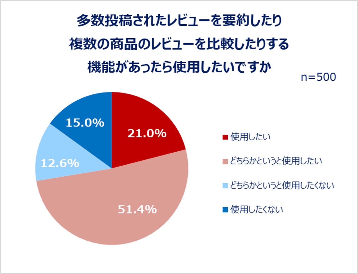 多くの貴重な意見が寄せられているレビュー。今後の期待についても探るべく、多数のレビューを要約したり比較したりする機能があったら使用したいか質問したところ、7割以上が使用したいと回答しました。レビューの進化には前向きな傾向がうかがえます。