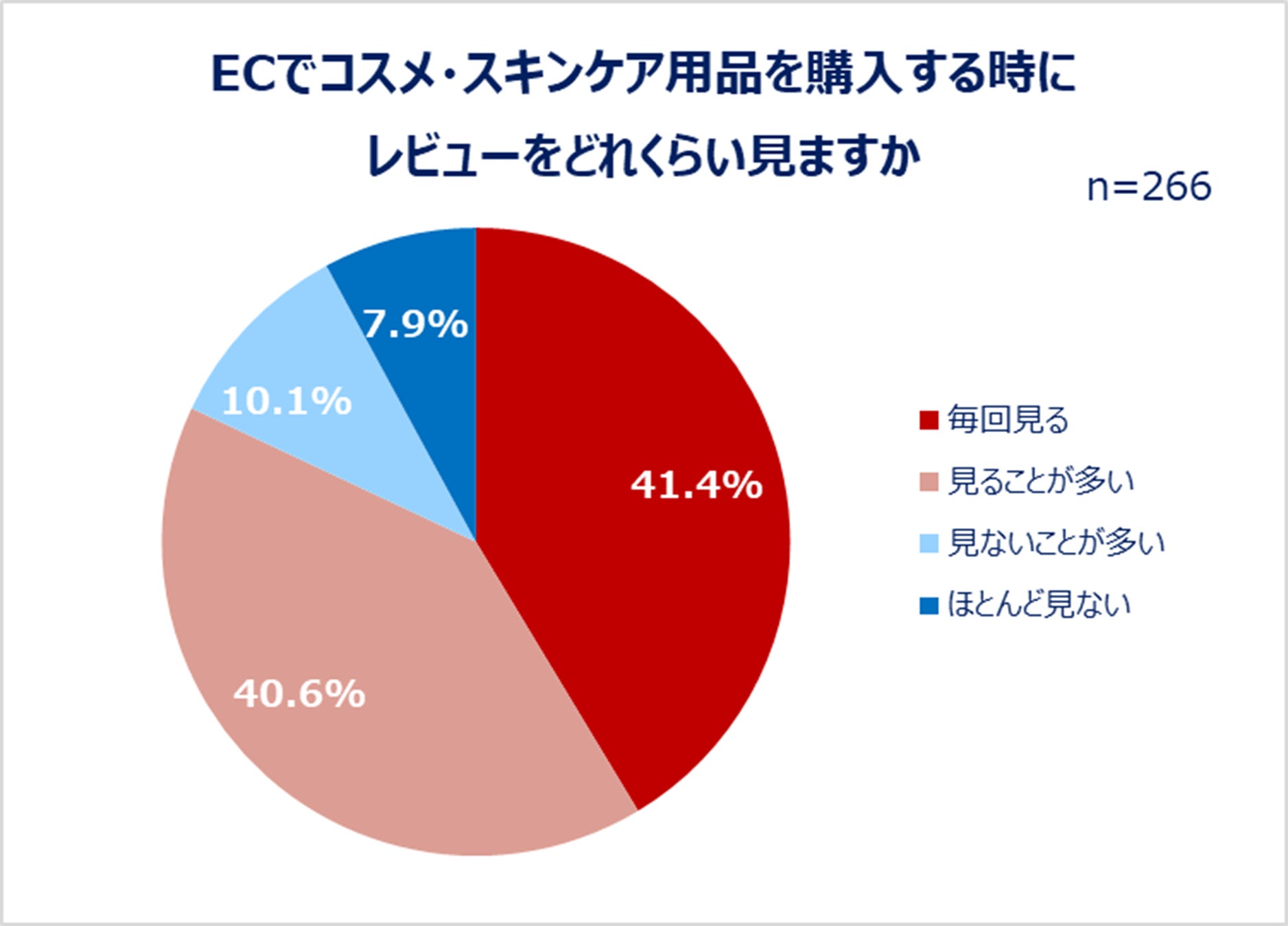 多くのECに取り入れられている「レビュー」について、どれくらい見ているかも聞いたところ、4割以上が「毎回見る(41.4%)」ことが判明。「見ることが多い(40.6%)」と回答した人も含めると8割を超え、レビューの重要性が見て取れます。