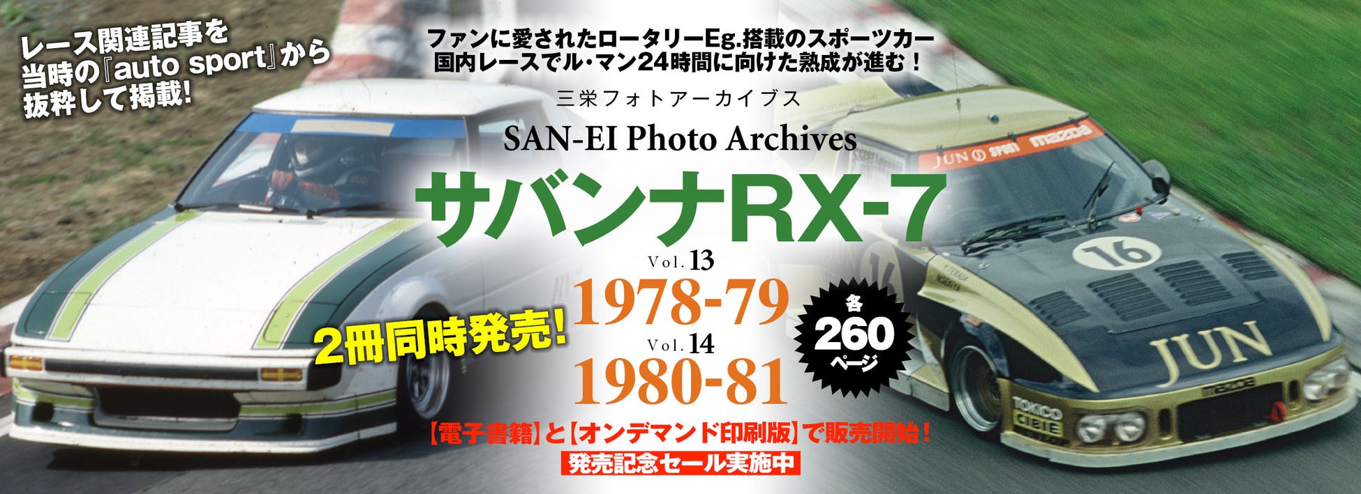 株式会社三栄(本社所在地:東京都新宿区)は、写真集『サバンナ RX-7 1978-79』を電子書籍とオンデマンド印刷版で発売しました。シリーズ第13弾となる今回の刊行テーマは初代RX-7。1978年から79年シーズンを追った写真ギャラリーをはじめ、モータースポーツ専門誌「オートスポーツ」から当時のレース内容を伝えるレポート記事を抜粋して再録しています。なお現在、発売記念セール中につき、同号および同時発売の『Vol.14 サバンナ RX-7 1980-81』を期間限定の特別価格にてご提供しています。