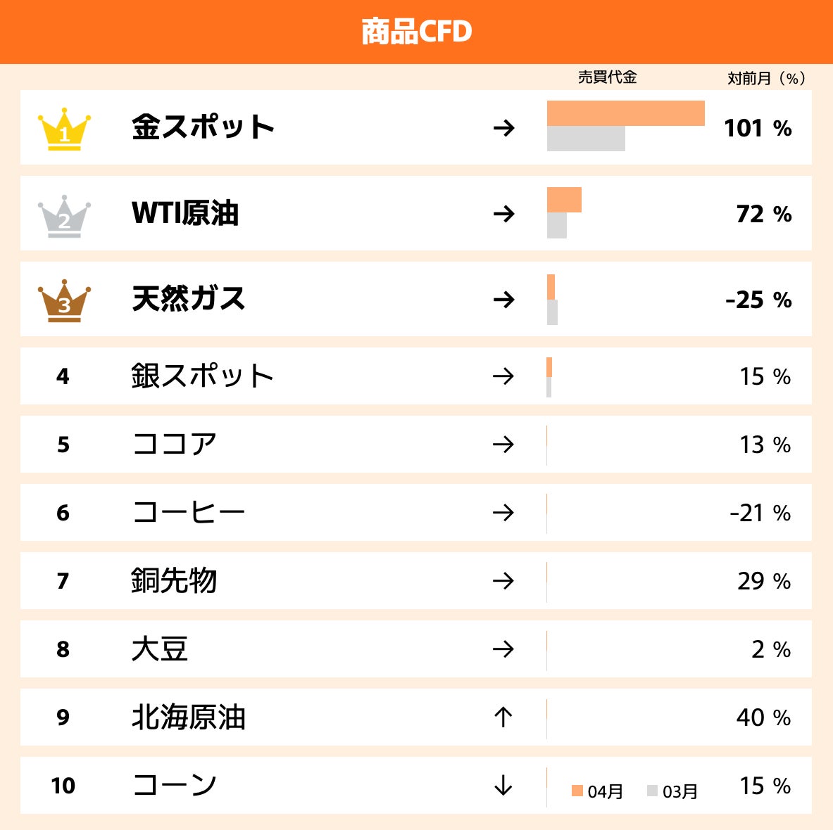 また、米国の相互関税政策に対する不透明感が高まる中で「安全資産」として知られる金(ゴールド)の価格が引き続き堅調に推移し、国際指標となるニューヨーク先物の価格が初めて3,500ドルを突破するなど大きく上昇したことから、当社の商品CFD「金スポット」の売買代金は前月比2倍超と大幅に伸長しました。