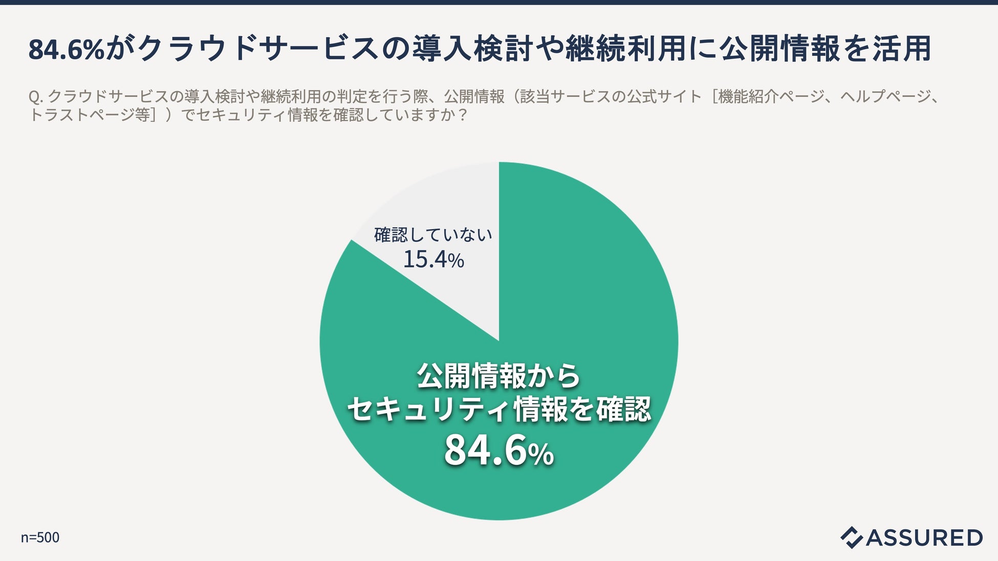 クラウドサービスの導入検討や継続利用の判定を行う際、公開情報(該当サービスの公式サイト[機能紹介ページ、ヘルプページ、トラストページ等])によるセキュリティ情報の確認有無を尋ねたところ、84.6%が確認していると回答がありました。