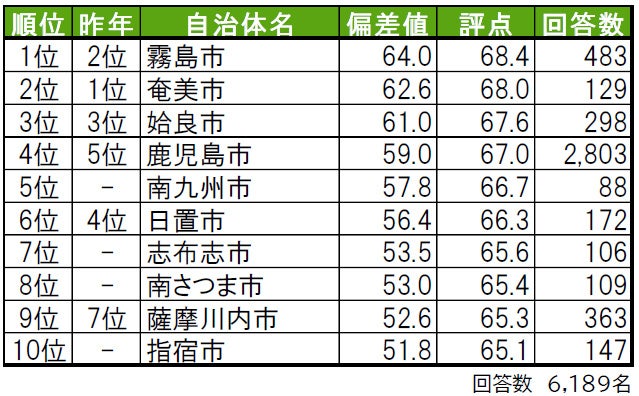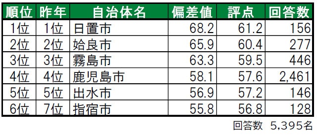 1位は日置市で、「街に誇りがある」「街に愛着がある」でも1位と高い評価を得ています。2位は姶良市で、「住みここち」1位、「街の幸福度」「街に誇りがある」「街に愛着がある」3位、「住みたい街」5位と、各ランキングで上位に入っています。3位は霧島市で、「街の幸福度」1位、「街に誇りがある」「街に愛着がある」2位、「住みここち」3位、「住みたい街」4位と各ランキングで高評価を得ています。トップ5は昨年から変動はなく、2年連続でのランクインとなっています。
