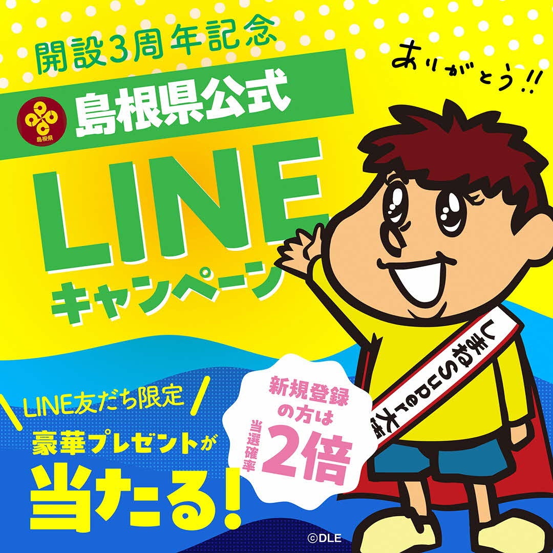公式LINE開設3周年を記念して、さらにLINE友だちを増やし、より多くの方に情報を届けるため、「島根県公式LINEキャンペーン」を実施いたします。簡単なアンケートにご回答いただいた方の中から抽選で30名様に温泉宿泊券や島根の特産品などプレゼント。すでにLINE友だちの方も参加可能です。期間中、新規でお友だち登録していただいた方は当選確率2倍となります!ぜひこの機会に登録・キャンペーンへの応募をお待ちしています。