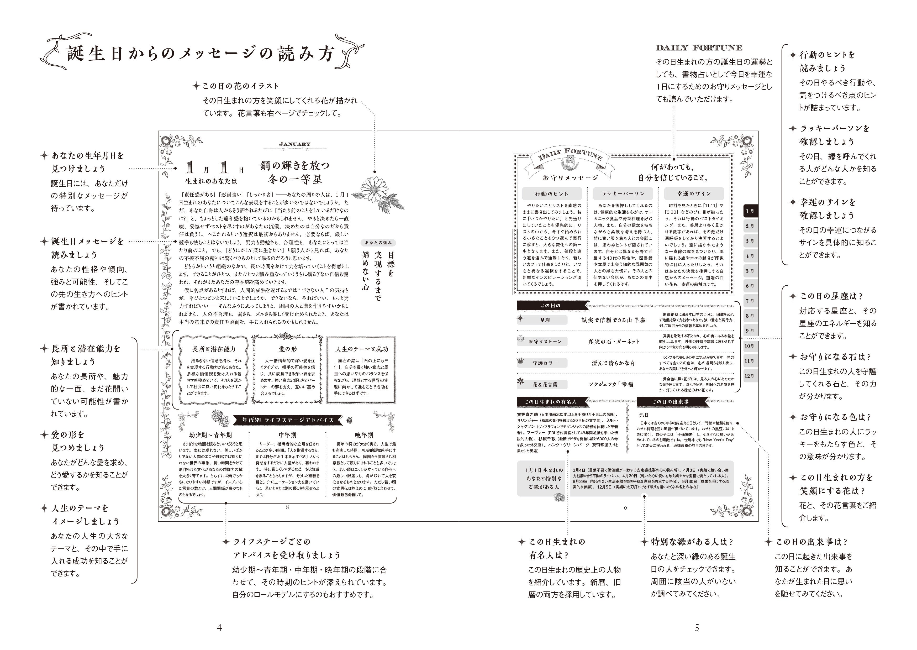 すべての誕生日には、その日に生まれた人の「才能」「愛の形」「人生のテーマ」「年代別アドバイス」など多彩なテーマ別に丁寧に読み解き、盛り込みました。