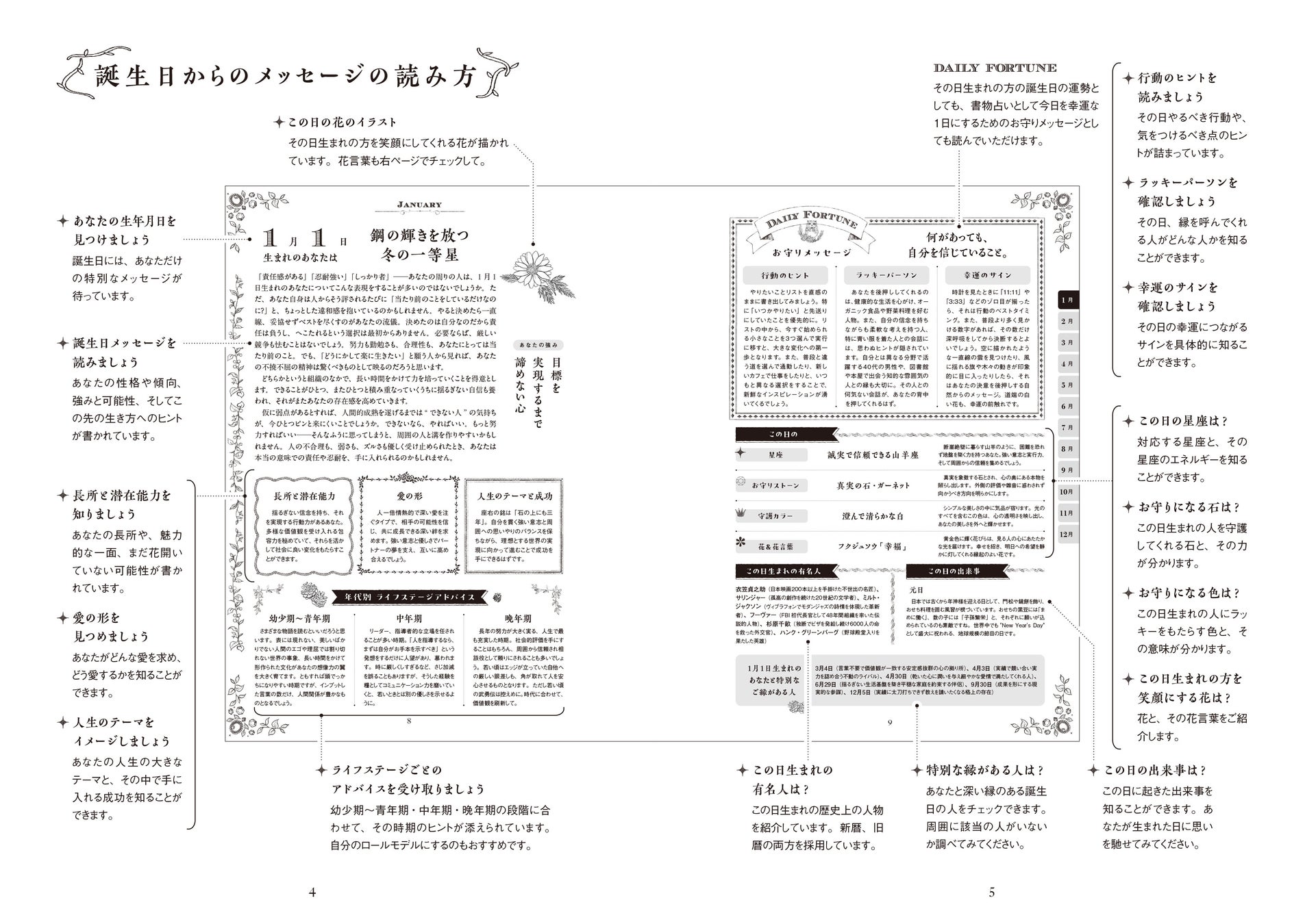 たとえば、1月1日生まれの人には「責任感」「忍耐強さ」「揺るぎない信念」といった資質が語られ、人生を貫く強さと優しさが丁寧に描かれています。