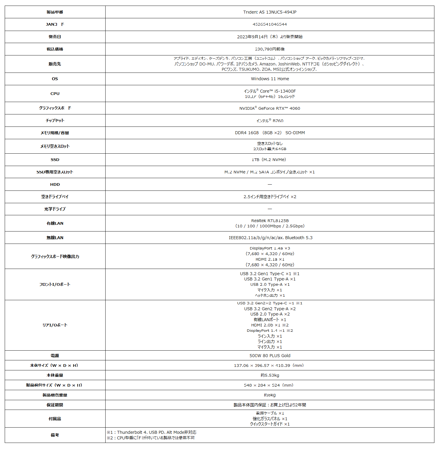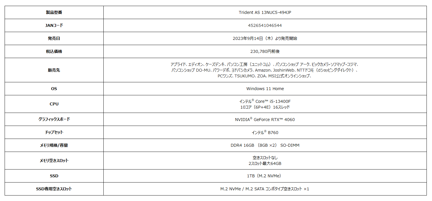 最新グラフィックスカードGeForce RTX™ 4060搭載のゲーミングデスクトップPC コストパフォーマンスに優れた「Trident AS 13NUC5-494JP」発売