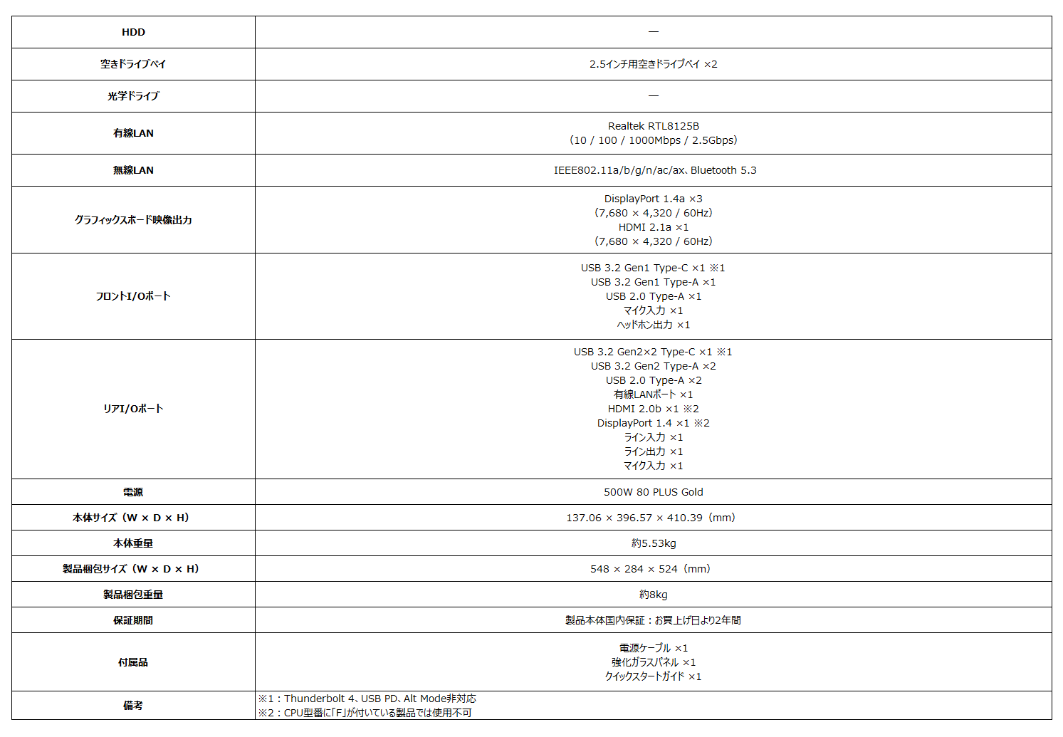 「Trident AS 13NUC5-494JP」は動作クロック向上・キャッシュの増加、新たに高効率コアであるEコアを搭載することにより大幅な性能向上を果たし、コストパフォーマンスに優れた第13世代インテル® Core™ i5-13400F、1世代前の同クラスと比べ最大で約1.7倍の性能を発揮しつつ、電力効率に優れたNVIDIA® GeForce RTX™ 4060を搭載し、フルHD環境において強力なゲーミング性能を発揮し、CPUなどの熱源を独立した区画に配置することで冷却効率を高め、置き場所に困らないスリム筐体を採用することで高性能・冷却性・コンパクトの3要素を実現したゲーミングPCとなっております。また、ストレージとして超高速動作のSSDを1TB搭載しており、ゲームの起動やプレイ中のロード時間を大幅に短縮し、大容量16GBメモリを搭載することでゲームやアプリの同時使用をストレスなく行うことができ、ネットワーク機能として2.5G LANポート、他の機器との干渉や混雑を避けて通信を行うことが可能なWi-Fi 6E機能で、設置場所を選ばずに快適なネットワーク環境をご利用いただけます。さらに、交換用の強化ガラスパネルが付属しており、本体のイルミネーション機能と組み合わせることで煌びやかなゲーミング環境を構築できます。