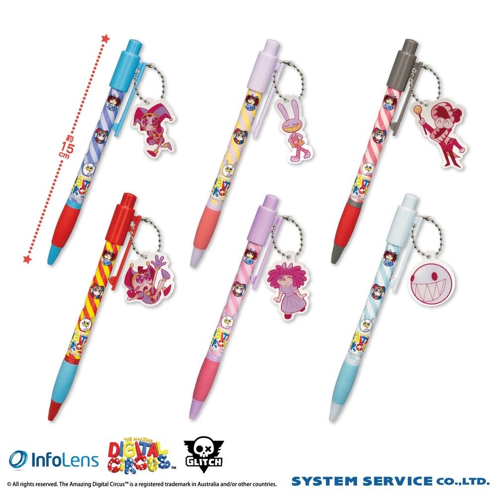 デフォルメされたマスコットが付いたキャラクターたちをイメージしたボディカラーの黒色のボールペン。怯える「ポムニ」、落ちる「ポムニ」、「ケイン」、「ジャックス」、「ラガタ」、「バブル」のチャームがついた全6種類。