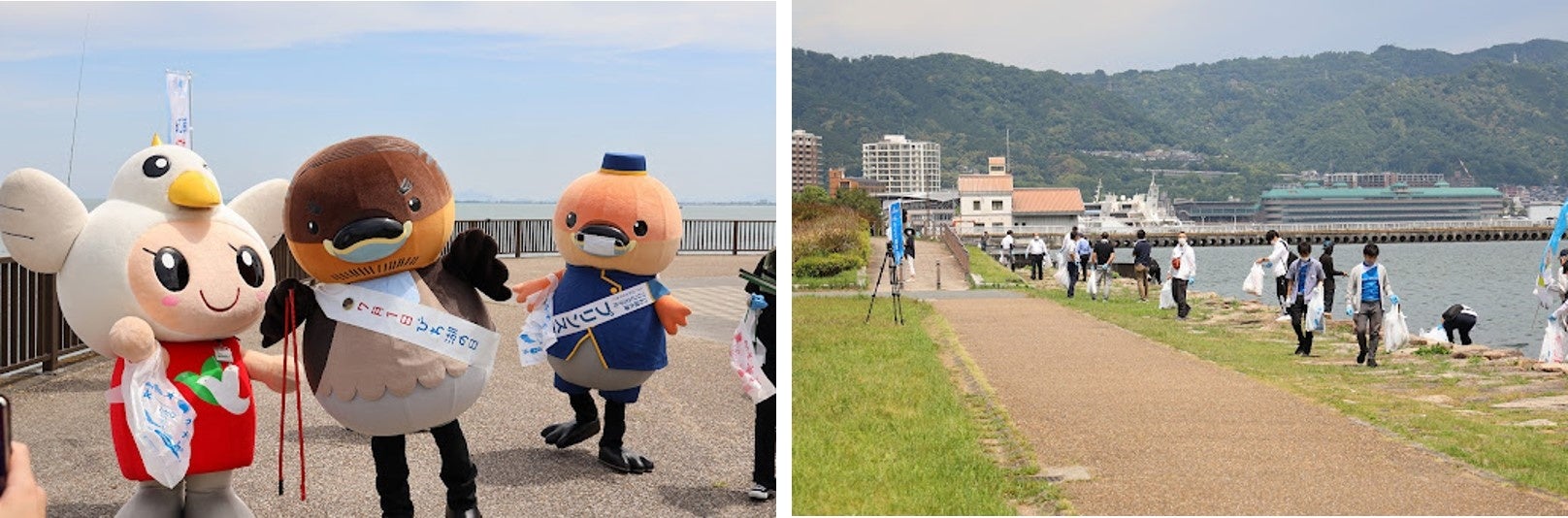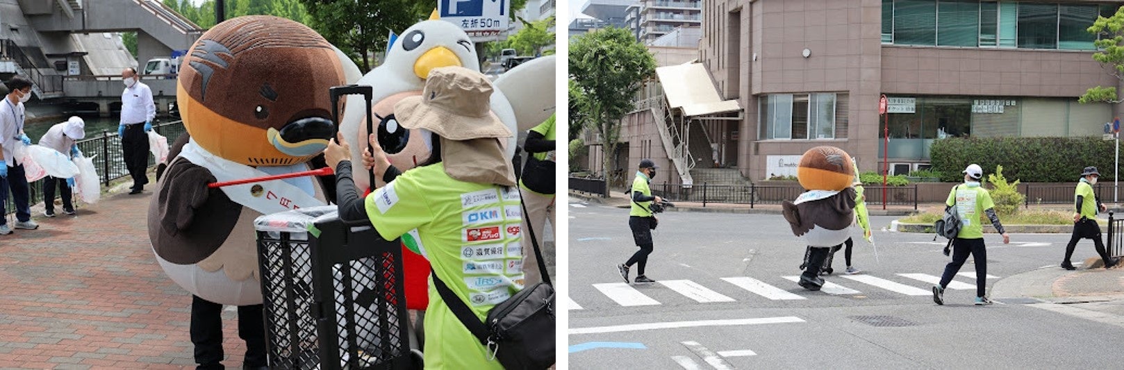 うみゴミ対策琵琶湖プロジェクト実行委員会は、滋賀県の人気キャラクター「野洲のおっさん」のびわ湖1周ごみ拾い行脚を、今年も「ごみゼロの日」である5月30日(月)午前10時に大津湖岸なぎさ公園 打出の森からスタートしました。この日は、企画に賛同する企業や団体約50名と一緒に「海ごみPR大使」に任命されている野洲のおっさんへエールを送りながら、湖岸の清掃活動を行いました。「野洲のおっさん」は、これからびわ湖1周200キロを清掃しながら歩き、海やびわ湖の大切さを伝えていきます。