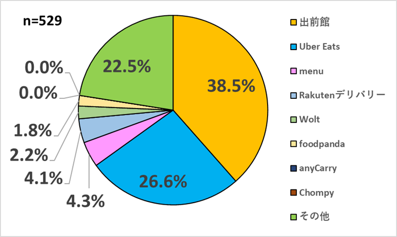 フードデリバリーを利用したことがあると回答した方に「利用したことのあるフードデリバリーはなんですか?」という質問をしたところ最も多かった回答は「出前館」で38.5%、次いで「Uber Eats」で26.6%となりました。