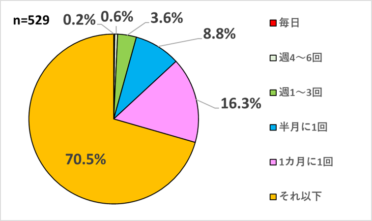 フードデリバリーを利用したことがあると回答した方に「どのくらいの頻度で利用しますか?」という質問をしたところ、最も多かったのは「それ以下」(1カ月に1回未満)で70.5%となり、次いで「1カ月に1回」で16.3%、「半月に1回」で8.8%となりました。