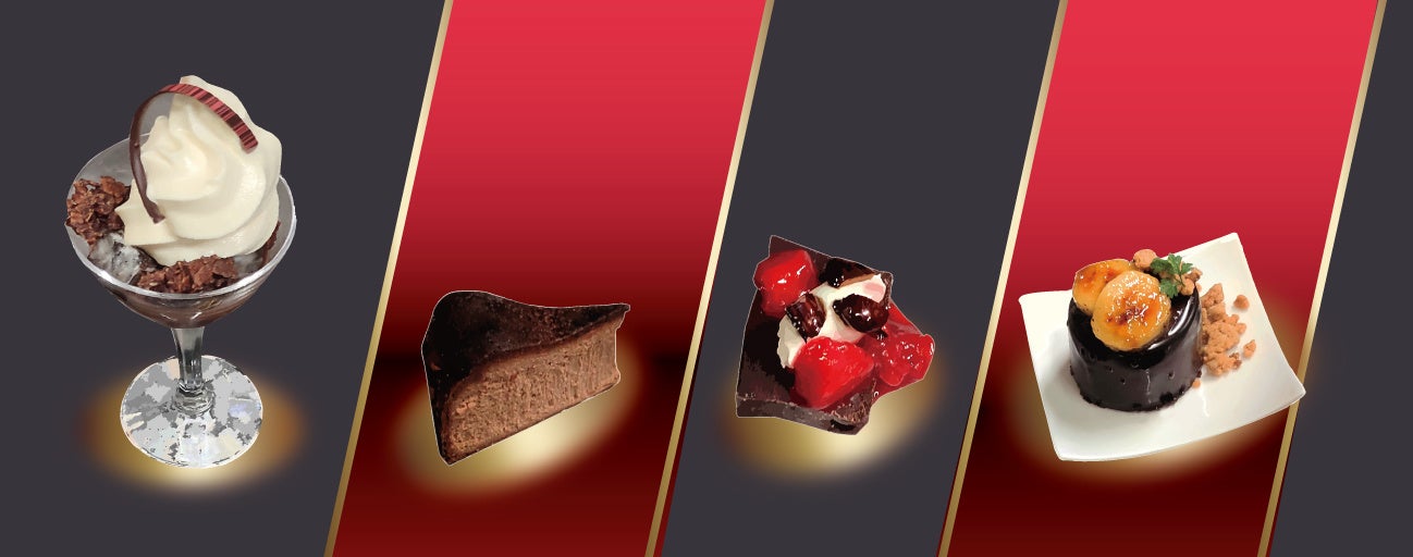 チョコレートムースと相性の良いバナナソテーを合わせてグラサージュで仕上げました。クランブルとの食感もお楽しみください。