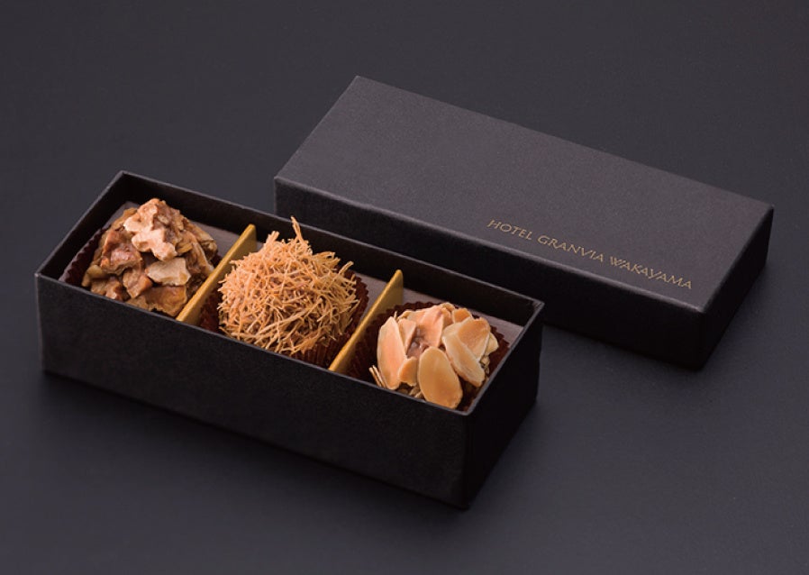 クルミ・カダイフ・アーモンドで包まれた四万十栗のペーストに、ローストしたヘーゼルナッツの風味が際立つジャンドーヤノワゼットをまとわせました。ホテルグランヴィア和歌山のパティシエの技が光るショコラをお楽しみください。
