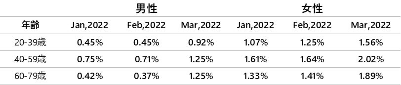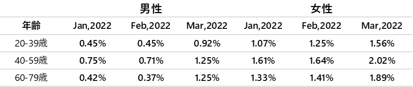 - 上昇率が最も大きいのは40~59歳・男性で2.02%、最も小さいのは20~39歳・女性で0.92%