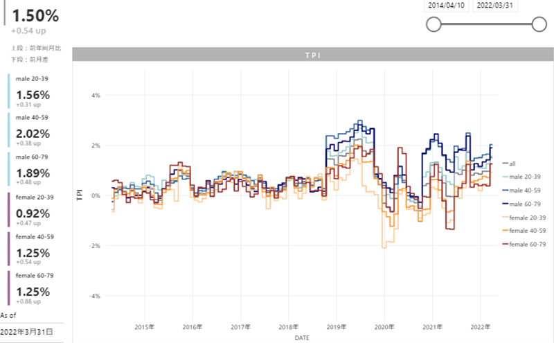 ~上昇率が最も大きいのは40~59歳・男性で2.02%、最も小さいのは20~39歳・女性で0.92%~https://mk.ccc.co.jp/tpi/