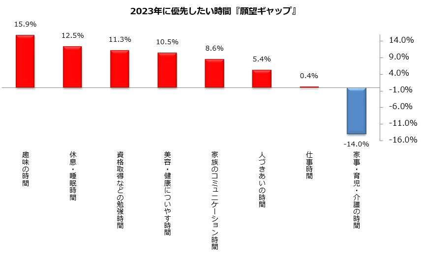 | 2023年に優先したい時間『願望ギャップ』について ※選択項目ごとに、「2023年に優先したいと願う時間」の比率から「2022年に優先した時間」の比率を引いた値。 ※「その他」は除いて集計。小数点第2位を四捨五入。 |