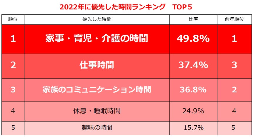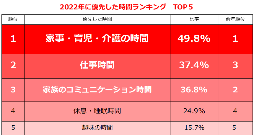 1.2022年に優先した時間 1位「家事・育児・介護の時間」49.8%