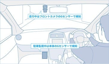 フロントカメラと本体それぞれにGセンサーを搭載。走行中にはフロントカメラのGセンサーを、駐車監視中には本体のGセンサーを使うことにより、車の衝撃を正確に検知します。