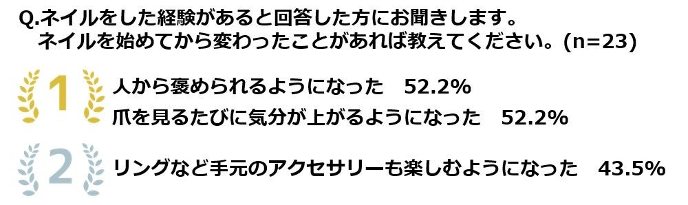 - ネイルを始めてから変わったことは、「人から褒められるようになった」「爪を見るたびに気分が上がるようになった」