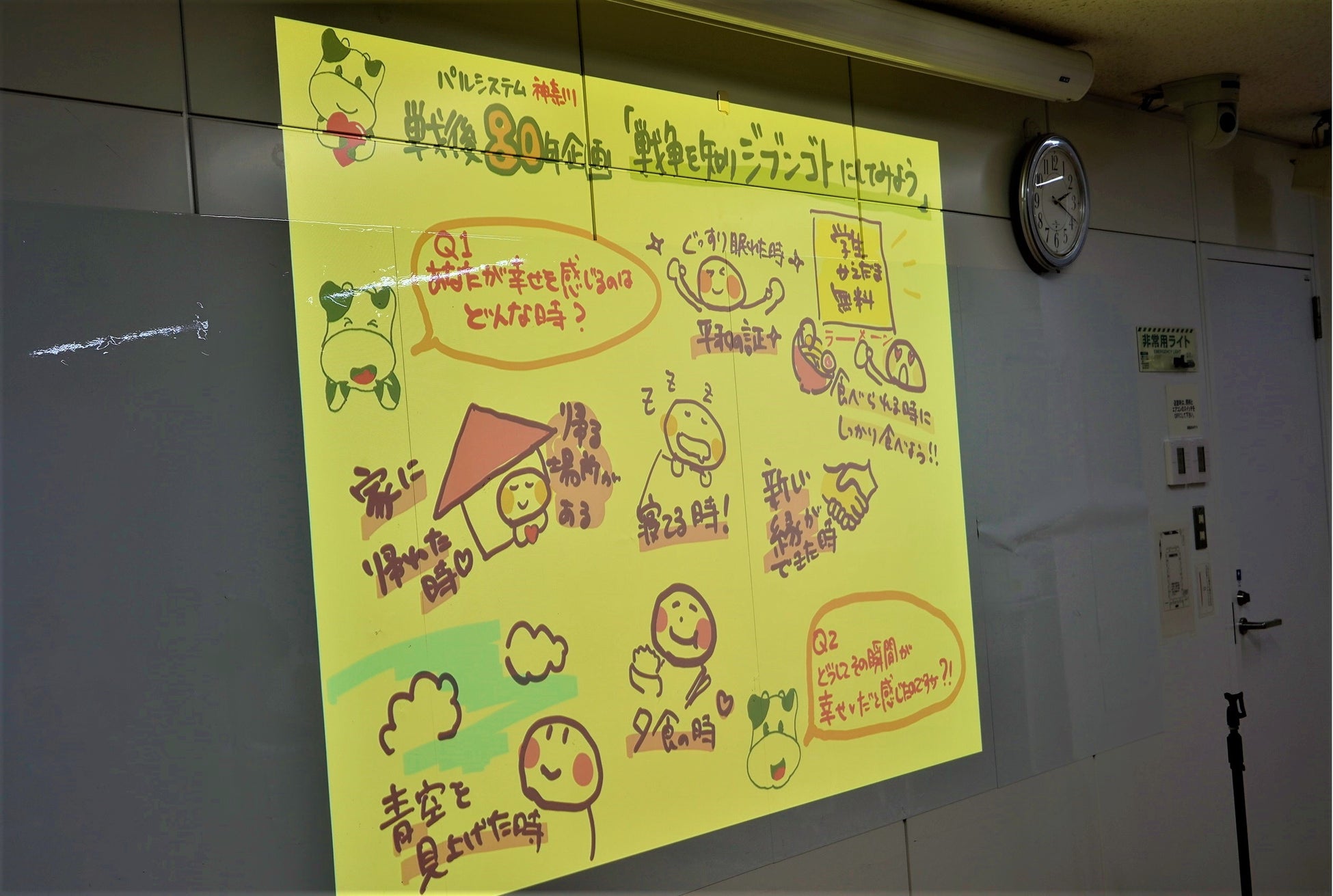 「ぐっすり眠れた時。不安や心配事が無い平和の証」「家に帰った時。帰って安心できる場所があることは、戦時下では保証されない」「ラーメンの替え玉が無料だった時。お腹いっぱいになるまで食べられないこともある」など、普段の幸せは平和な社会があってこそだと確認し合いました。