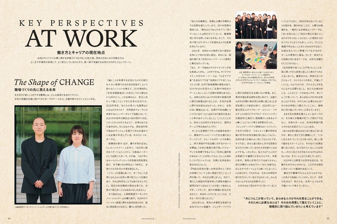 現在の日本における働き方はどこまで多様性が実現し、どのように変化しているのか。制度と意識、その両方からアプローチをし、自分の意志で選んだことを誰かのためにも実践している女性たちがいます。第一線で活躍する女性たちの声とともに、その実態を徹底レポート。女性の活躍を応援し、ジェンダーバイアスに関する研修を全社員に向けて実施、育児休暇を取る男性社員へのレクチャーなど、制度や教育を通じて社内の意識や風土そのものの変革を目指すポーラの取り組みや、映画やドラマのストリーミングでおなじみのNetflixが導入している独自の講習制度「リスペクト・トレーニング」など、混沌とした現代を働きながら生きる女性たちのリアルな声と姿を紹介します。