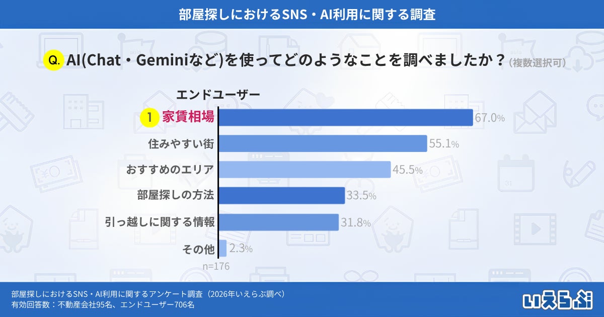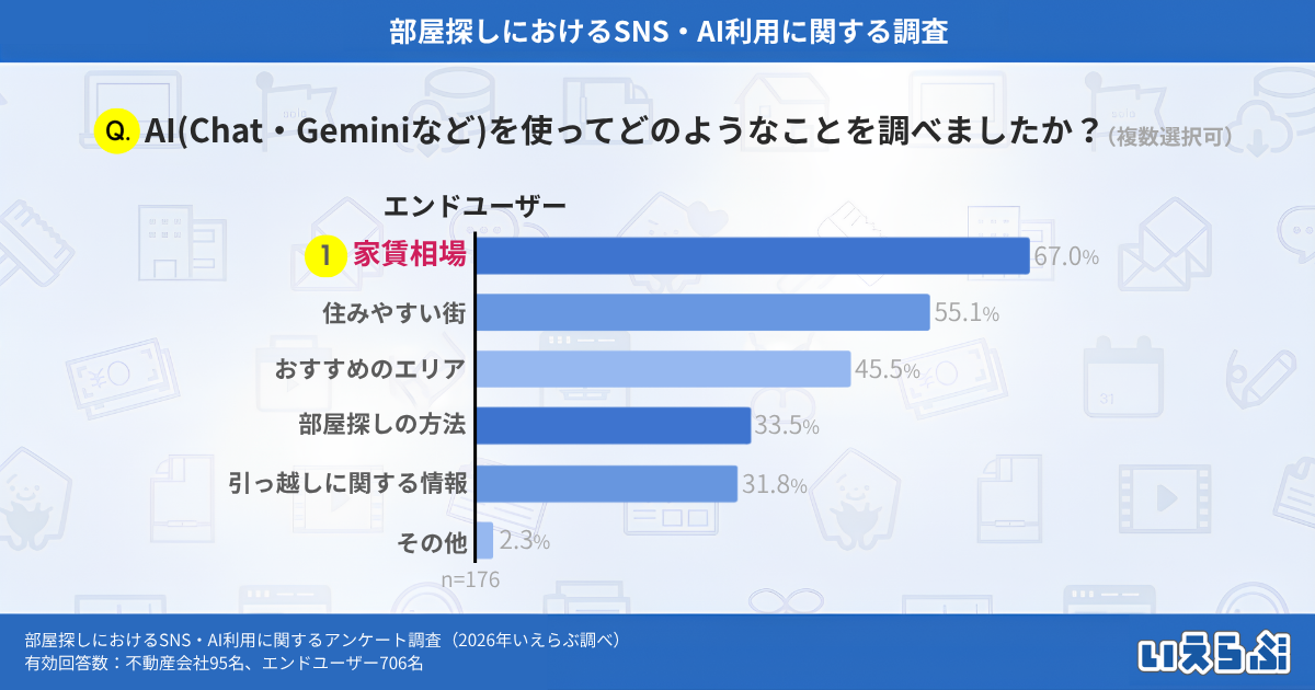 部屋探しにおいて、AIを「積極的に利用している」「時々利用している」と回答したエンドユーザー(※4)に「AIを使ってどのようなことを調べましたか?」という質問をしたところ、「家賃相場」という回答が最も多く67.0%でしたが、「住みやすい街」(55.1%)、「おすすめのエリア」(45.5%)と、エリア選びに関する回答も多く見られました。