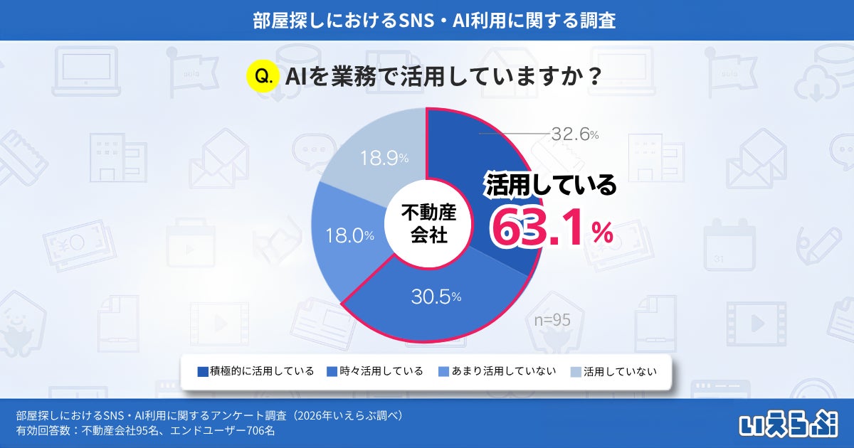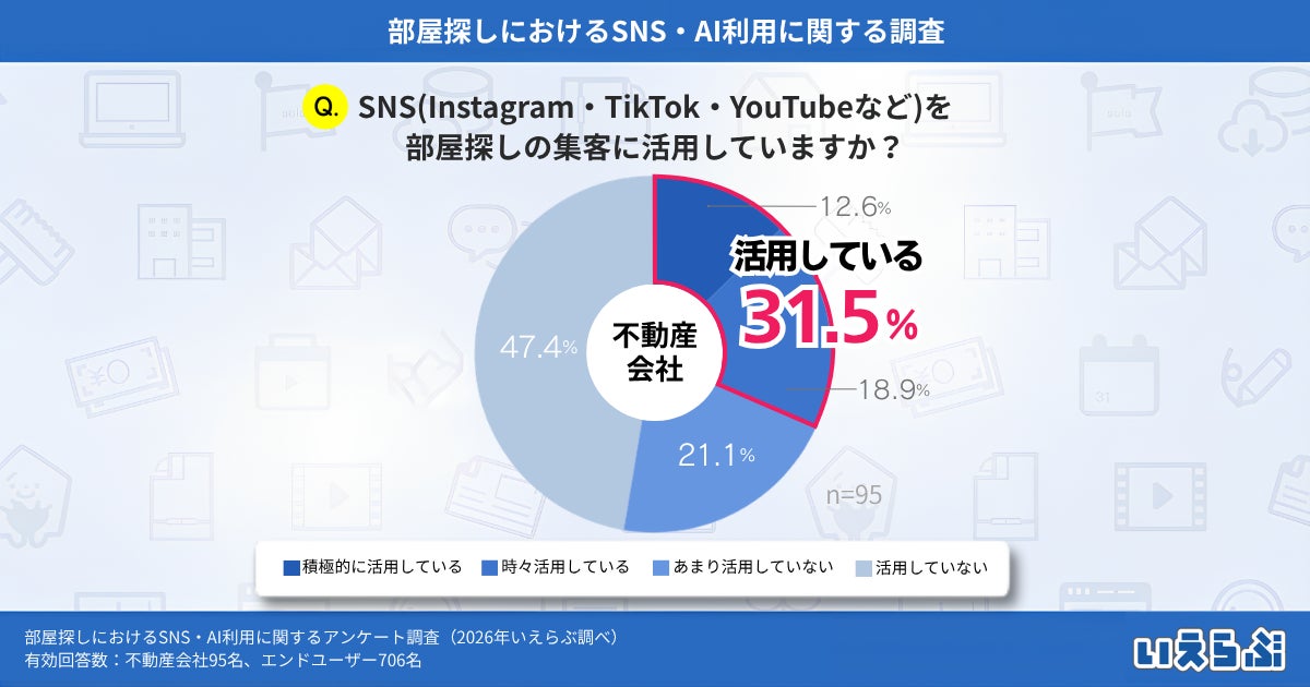 不動産業界特化のDX支援サービスを展開する、株式会社いえらぶGROUP(本社:東京都新宿区、代表取締役:岩名泰介、以下「いえらぶGROUP」)は、不動産会社・エンドユーザーに対して「部屋探しにおけるSNS・AI利用に関するアンケート調査」を実施しました。有効回答801件の調査結果を発表します。