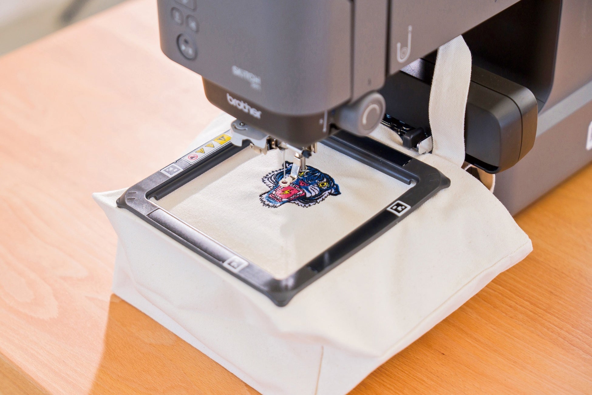 ・・・フリーアーム仕様で、家庭用刺しゅうミシンでは難しかったTシャツの袖やバッグなど筒状のアイテムにも刺しゅうができる。
