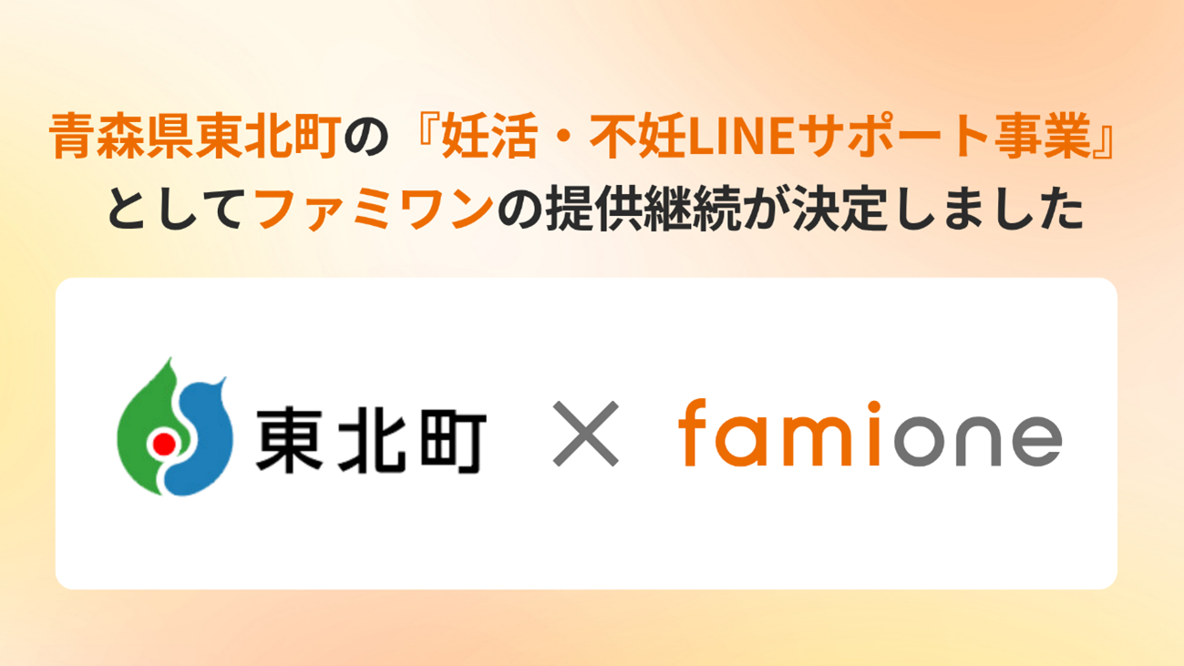 「子どもを願うすべての人によりそい 幸せな人生を歩める社会をつくる」をビジョンに掲げ、法人の従業員向け福利厚生や自治体の住民向け支援を行うヘルスケアサポートサービス「ファミワン」 https://famione.com/benefit/ などを展開する株式会社ファミワン(本社:東京都渋谷区、代表取締役:石川 勇介)は、青森県上北郡東北町(町長:長久保 耕治、以下東北町)からの委託を受け令和4年度より導入された「妊活・不妊LINEサポート事業」において、令和8年度も引き続きサービスの提供継続が決定いたしました。