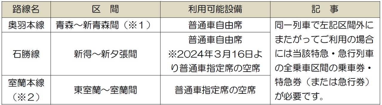 ・青い森鉄道線、いわて銀河鉄道線、北越急行線の普通列車もご利用可能。
