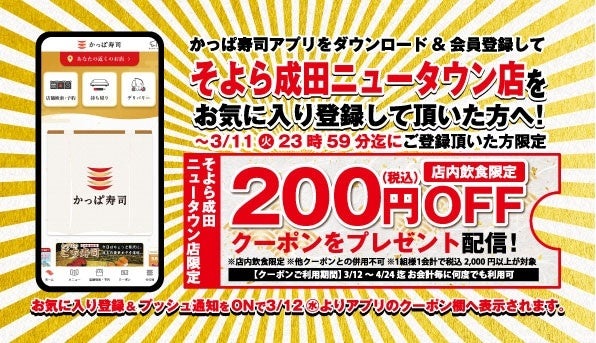 公式アプリ(https://www.kappasushi.jp/support/appl)をダウンロード&会員登録いただき、3月11日(火)23時59分までに『そよら成田ニュータウン店』をお気に入り登録いただくと、3月12日(水)から4月24日(木)まで、お会計毎に何度でもご利用いただける“店内飲食限定200円(税込)OFFクーポン”をプレゼント配信いたします。