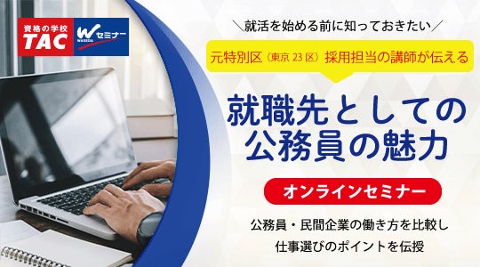 公務員、日商簿記検定、税理士、公認会計士などの資格取得に向けた教育サービスを展開しているTAC株式会社(東京都千代田区、代表取締役社長:多田敏男)は、7/26(火)に特別区(東京23区)元採用担当の方を講師に迎え、就職先としての公務員の魅力をオンラインでお話しいただきます。講師自身のこれまでの経験を踏まえ、人と社会のために働いているという実感や、多種多様な職種と職場環境、福利厚生制度、女性の採用状況等の盛沢山の内容で語っていただきます。