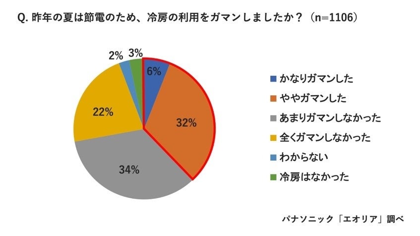 また、昨年のエアコン利用状況についてたずねたところ、「かなりガマンした」(6%)、「ややガマンした」(32%)と、実際の利用状況として38%が昨夏の“エアコンガマン派”だったことがわかり、今年は“エアコンガマン派”が増加していることが浮き彫りになりました。