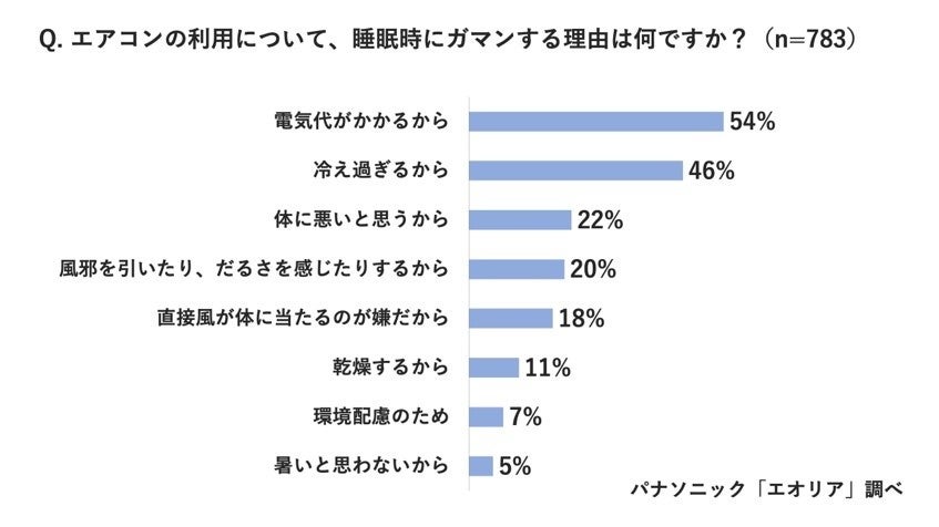 いずれの場合も、「電気代がかかるから」が最も多い結果となっており、「冷えすぎるから」と続きます。「体に悪いと思うから」「直接風が体に当たるのが嫌だから」という回答も多く、睡眠時に特に多かったのが「風邪を引いたり、だるさを感じたりするから」という理由でした。