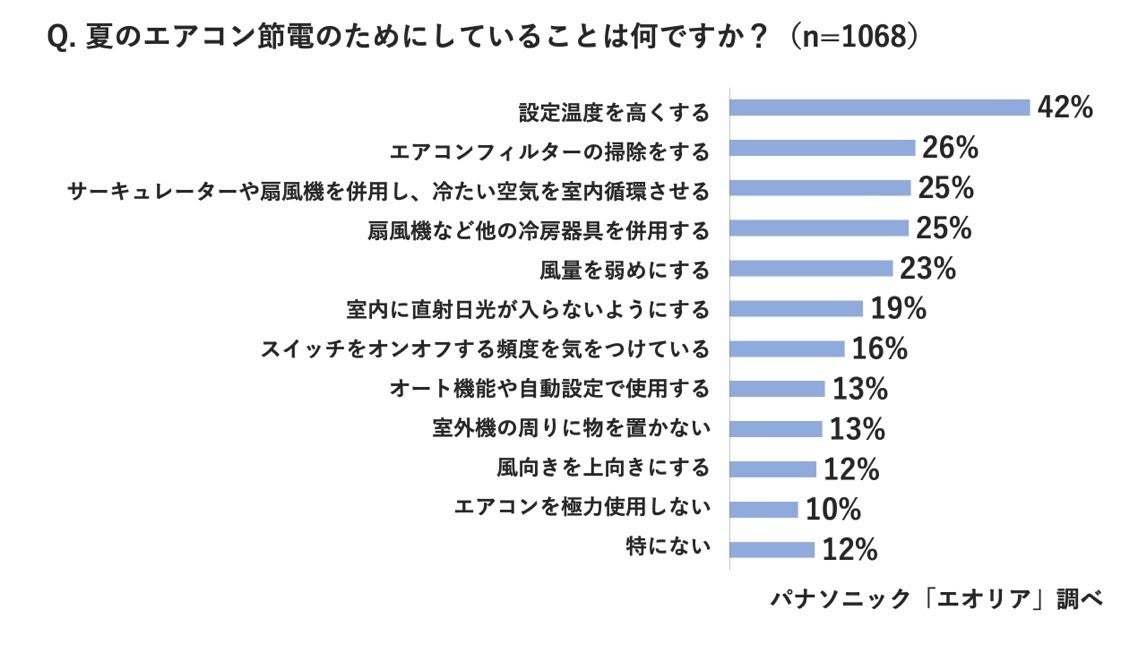 「夏のエアコン節電のためにしていることは何ですか」という質問では、設定温度をたずねる質問でも同様の結果が出たように「設定温度を高くする」(42%)が圧倒的に多い結果に。その他には、「エアコンフィルターの掃除をする」(26%)、「サーキュレーターや扇風機を併用し、冷たい空気を室内に循環させる」、「扇風機など他の冷房器具を併用する」がそれぞれ25%となりました。