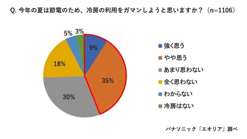 「今年の夏は節電のため、冷房の利用をガマンしようと思いますか?」という質問では、「強く思う」(9%)、「やや思う」(35%)と44%が今夏の“エアコンガマン派”であることがわかりました。