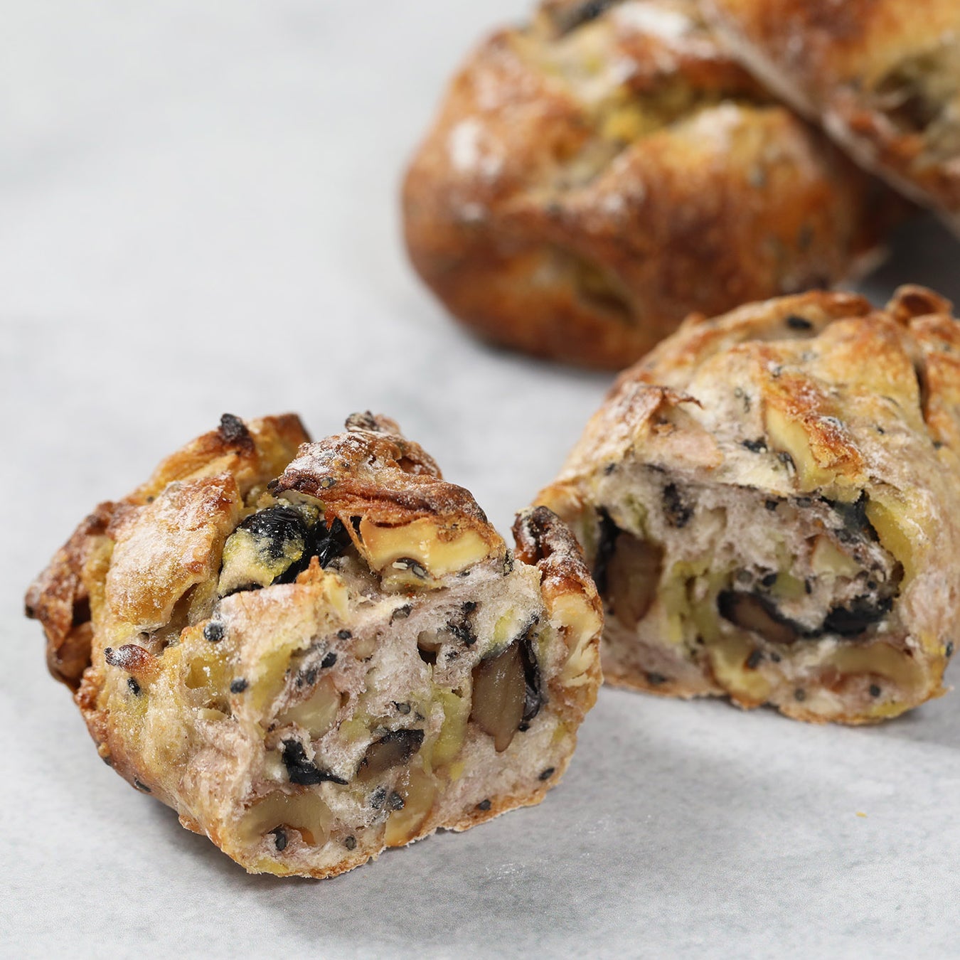 2023年5月〜6月にご好評いただいた『3種のナッツとホワイトチョコの抹茶ブロート』に続くハード系食事パンの第二弾。程よく酸味のあるライ麦粉入りの生地が、しっかり旨味が詰まった干し芋と黒豆の優しい甘さを引き立てます。噛み応えのある生地に黒胡麻の香りが心地よい、ハード系のパンです。ワインとのペアリングもおすすめです。