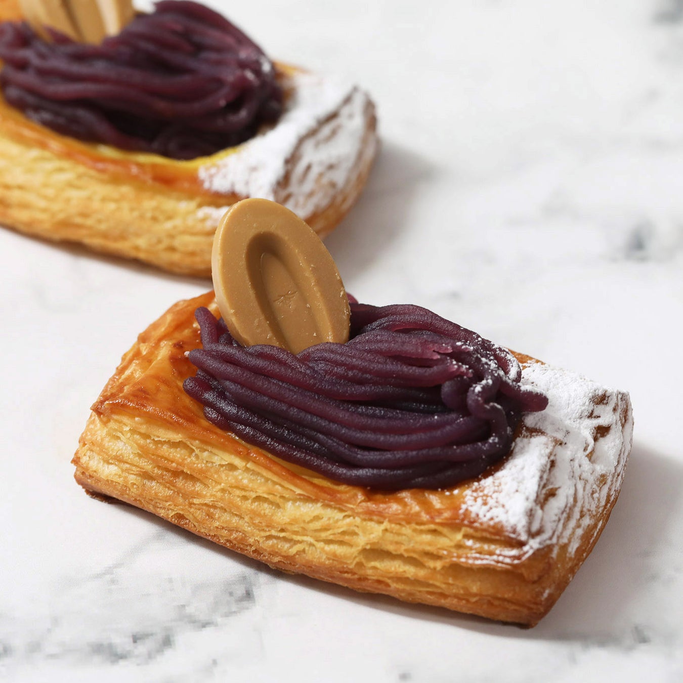 発酵バターを練りこんだ風味豊かなデニッシュ生地にカスタードクリーム、モンブランに見立てた紫芋餡とフランス産のチョコレートをのせて仕上げました。カスタードと紫芋餡の絶妙な味わいに、わずかな塩気を感じるチョコレート。紫芋の風味がコラボした、色鮮やかな季節のデニッシュです。