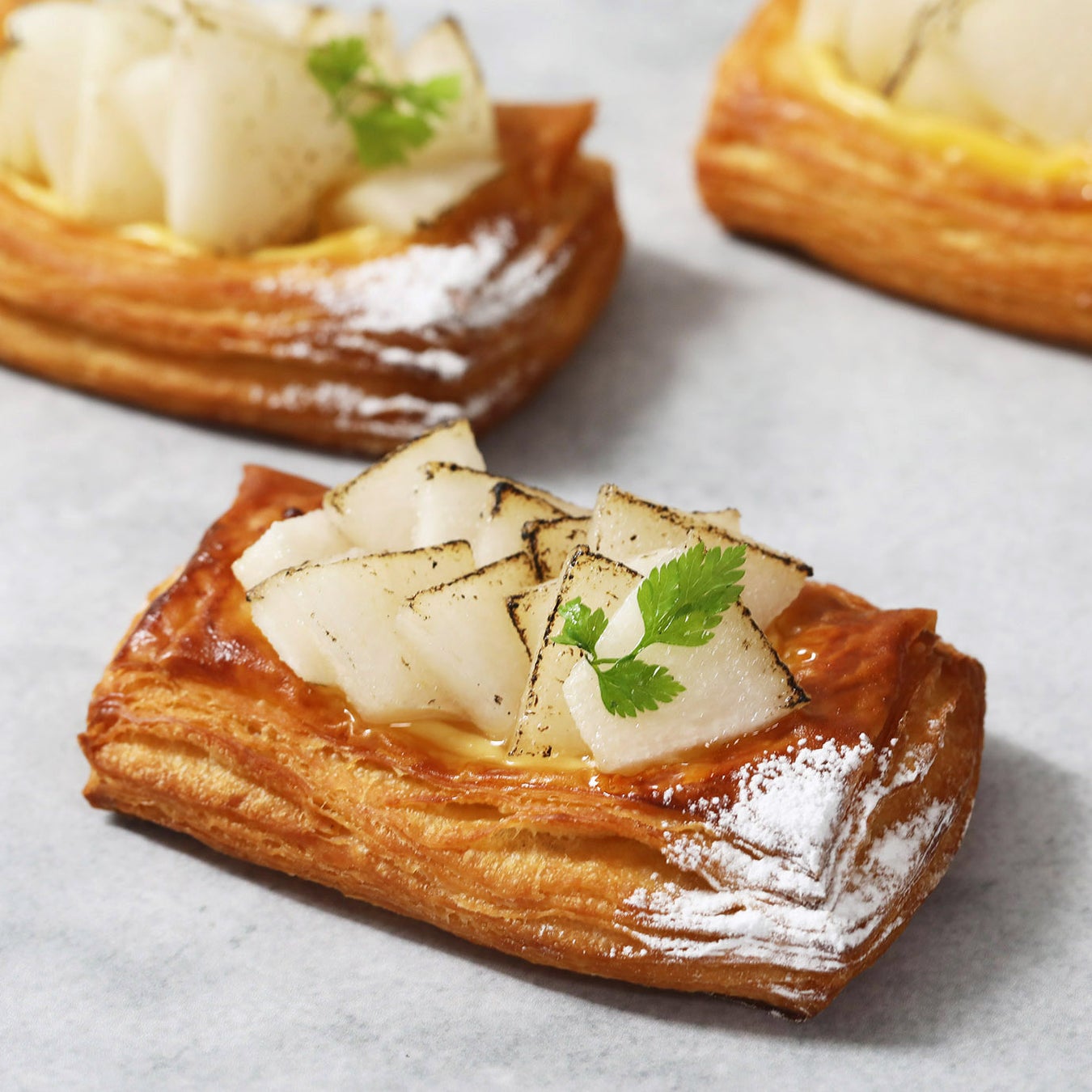 発酵バターを練り込んだ風味豊かなデニッシュ生地にカスタード、和梨をのせて仕上げました。爽やかな甘味の和梨とシャキシャキとした食感が楽しい秋のデニッシュ。ひと口頬張れば、口いっぱいにカスタードと和梨の甘味が広がります。