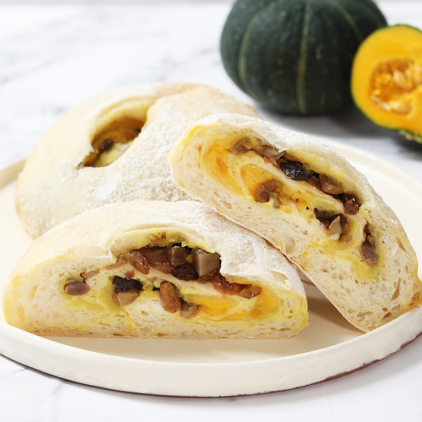 芋・栗・南瓜、秋に旬を迎えるおいしい素材を詰め込んだ季節のブールです。もちもちとした生地にスイートポテトフィリング、南瓜クリーム、甘栗かのこ、ラム酒漬けレーズンを包んで焼き上げました。ラム酒漬けレーズンを入れることで、芋・栗・南瓜の優しい甘みや香りを引き出す味わいに。秋の味覚をブール1個でご堪能いただける、具沢山なブールです。